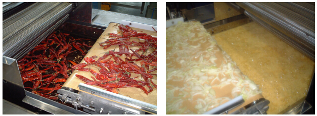 投入洋葱、辣椒、大蒜等蔬菜等,数秒钟后,浮出油面、排出油,通过传送带送出去