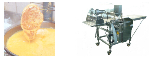 ·把扑粉、挂浆、上面包糠的肉放入油中加热,在与空气绝缘的状态下油炸,做出来有甜香的味道。