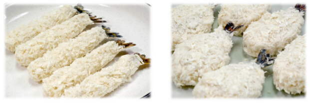 在粘上面浆的虾上均匀扑上面包糠(干面包糠或湿面包糠)。
